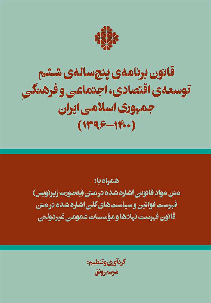 عنوان کتاب: قانون برنامه پنجساله ششم توسعه اقتصادی، اجتماعی و فرهنگی جمهوری اسلامی ایران (1400-1396)